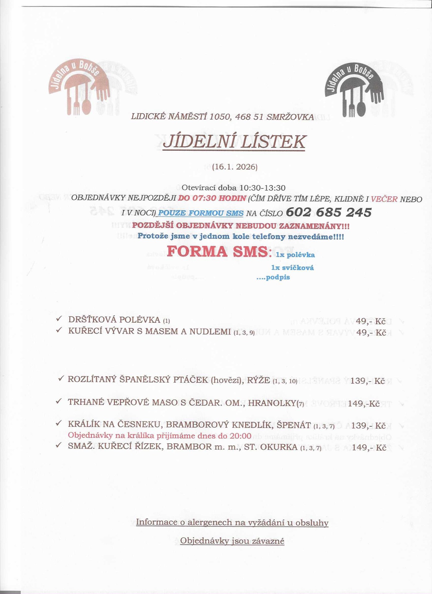 Rezervace POUZE FORMOU SMS